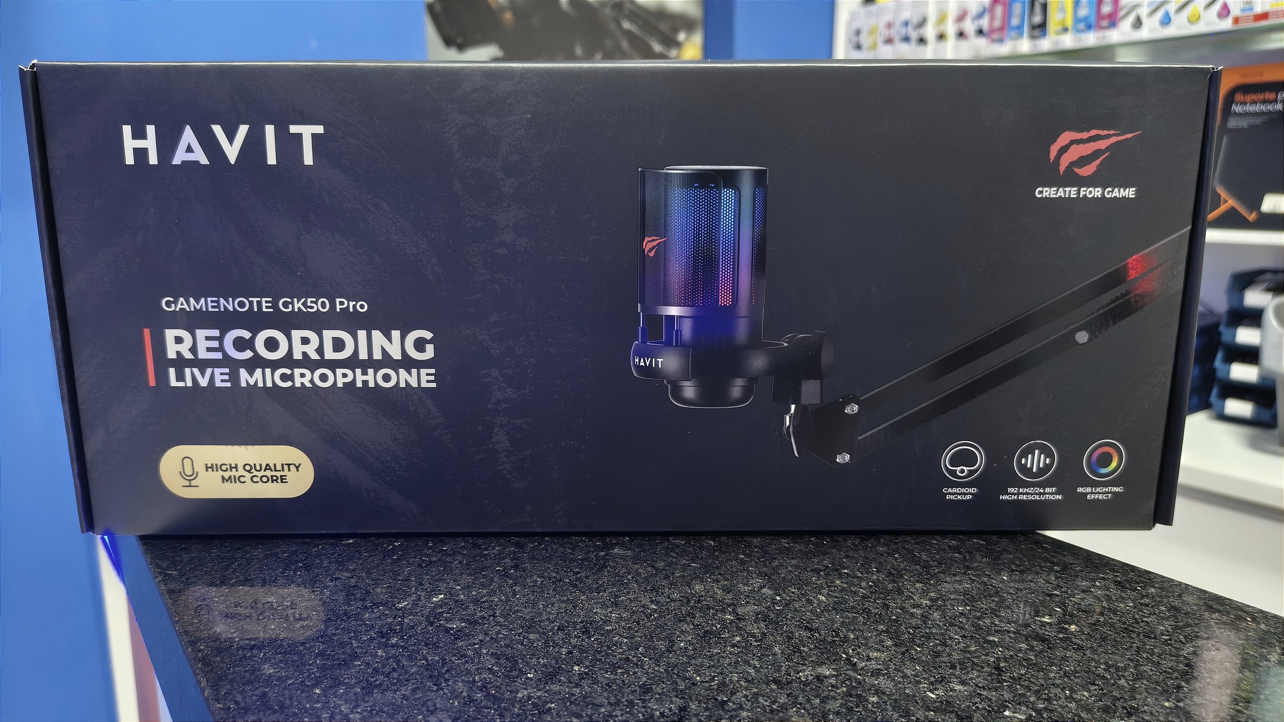 Microfone gamer da marca Havit, modelo GK50 Pro, uma das marcas mais conceituadas em game. O diferencial deste modelo Pro para o modelo normal é o braço articulado com ajuste de lateral de mesa ao invés do apoio sobre a mesa. Com um visual moderno e iluminação RGB, o GK50 Pro se destaca na mesa do gamer, adicionando um toque visual ao setup. Sua construção robusta transmite durabilidade e resistência, ideal para uso diário. O braço pode ser ajustado em várias posições.